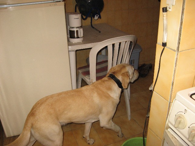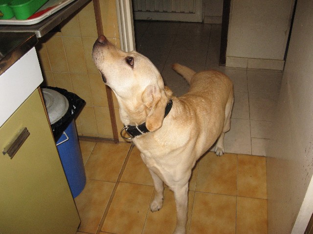 旅行とは関係ない写真。ロキがこんな真剣な顔をしているときといえば、食べ物を待っている以外にありえません。台所でスイカの端切れをもらおうと待ち構えています。
