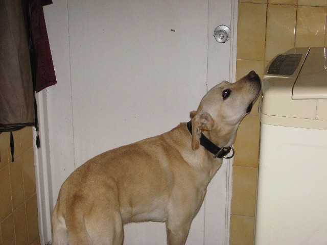 洗濯機の匂いをかいでいるように見えますが、ドアがパティオに通じているのでそこから匂いが来るのかと思っているようです。