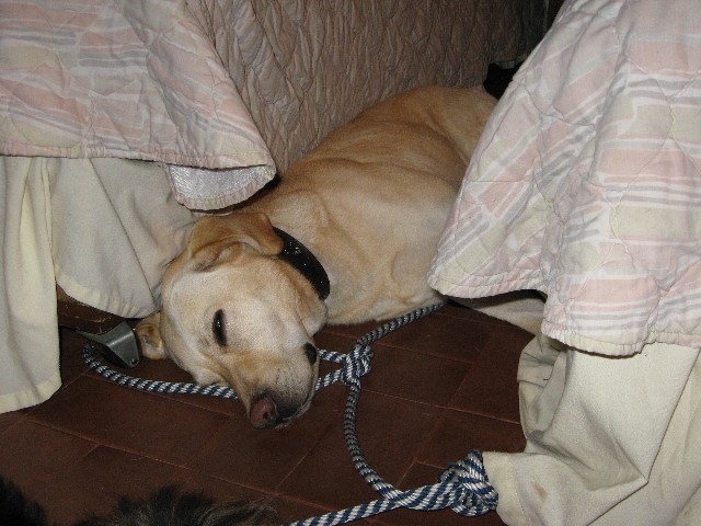 ホテルには犬がOKかどうかを聞いて予約しました。イレギュラーな客だったようですが、犬用の毛布まで出してもらえました。その好意を無にして部屋の中で好き勝手しないよう、寝るときもひも付きです。あわれ。バリケンがあるとよかったんですが、載せるスペースがなかったんですよね…。