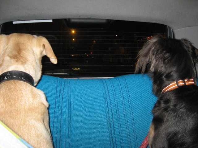 と言っているかはさだかではありませんが、うちの駐車場の前で感無量の2匹。実際には夫が車の外に出たのでそっちを見ているだけなんですが、車から降りたときは2匹とも必死にあたりの地面のにおいをかいでいたので、なんらかの感動はあったようです。
